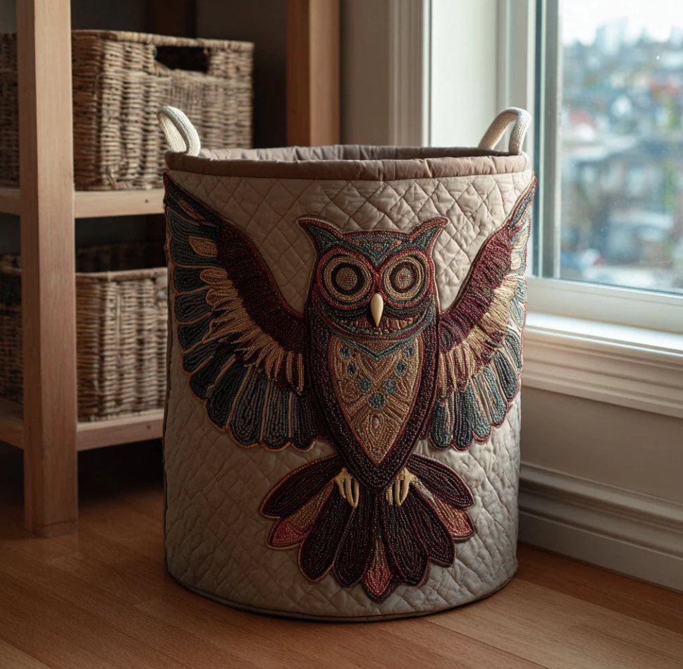 Exquisite Owl Pattern Quilted Laundry Basket Eco-Friendly Machine Washable Storage Container for Home Study Room Bedroom Organization | Owl