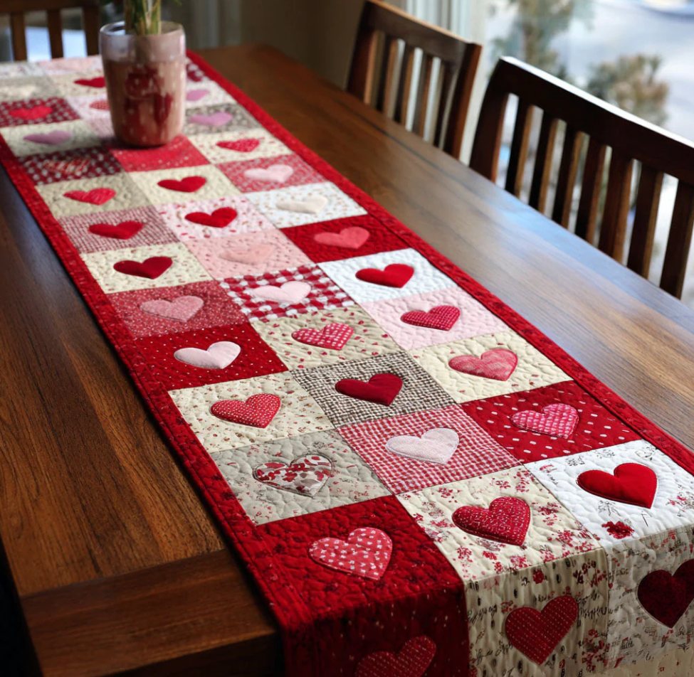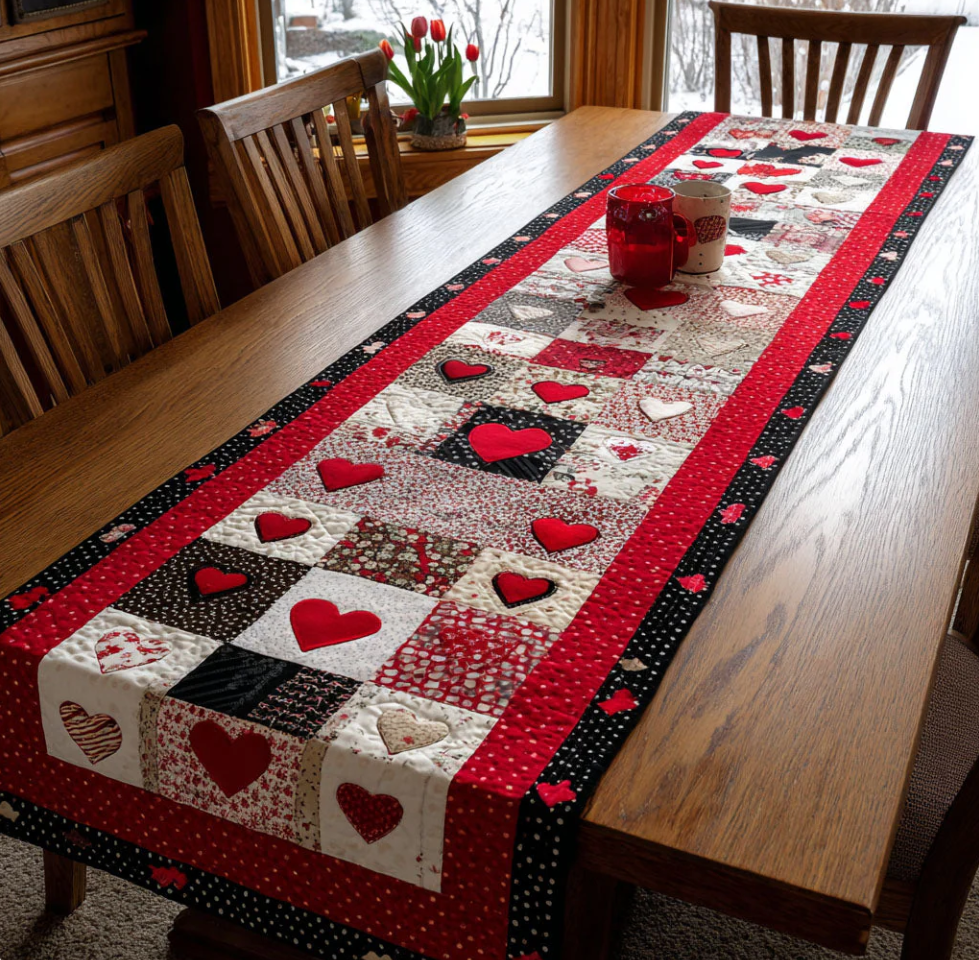 Romantic Love Themed Embroidered Heart Pattern Quilted Table Runner with Patchwork Design & Soft Textured Decor | Love