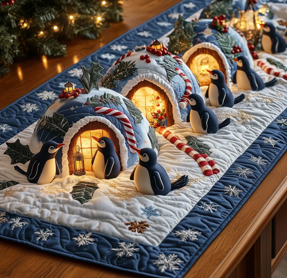 Cute Penguin & Igloo Pattern Eco-Friendly Handcrafted Quilted Table Runner | Penguin